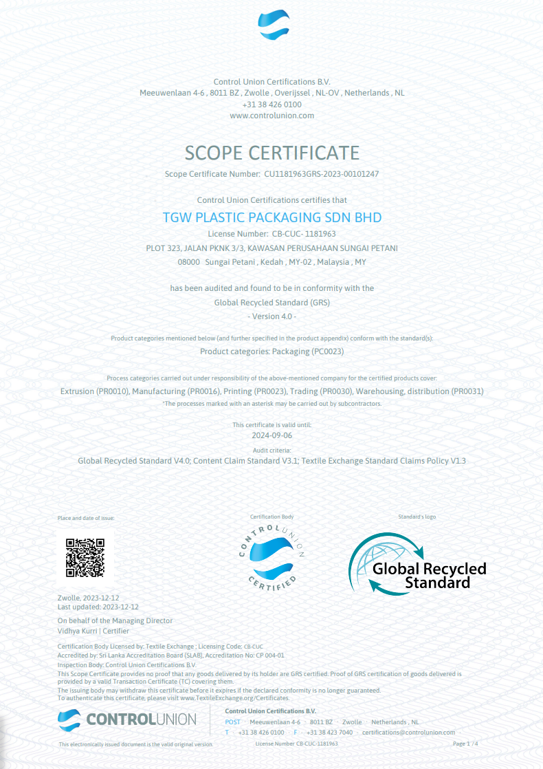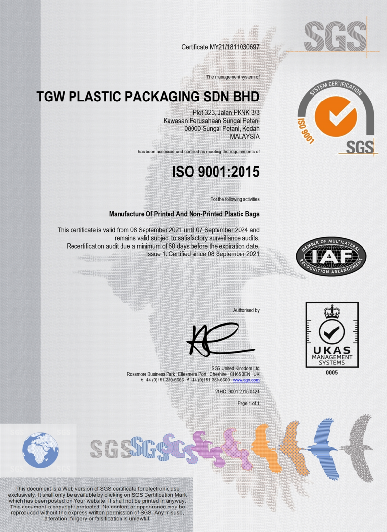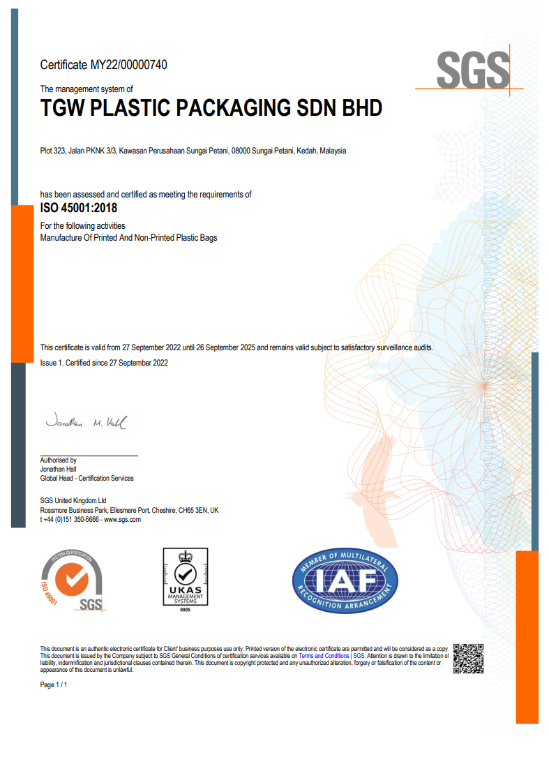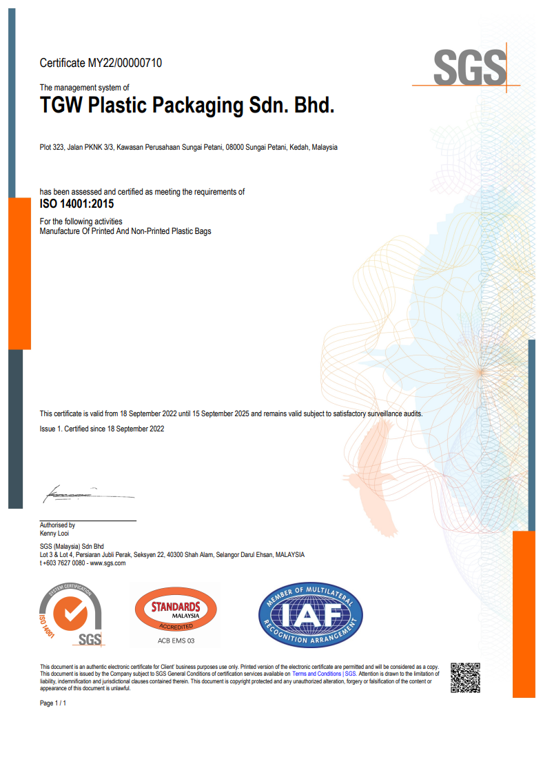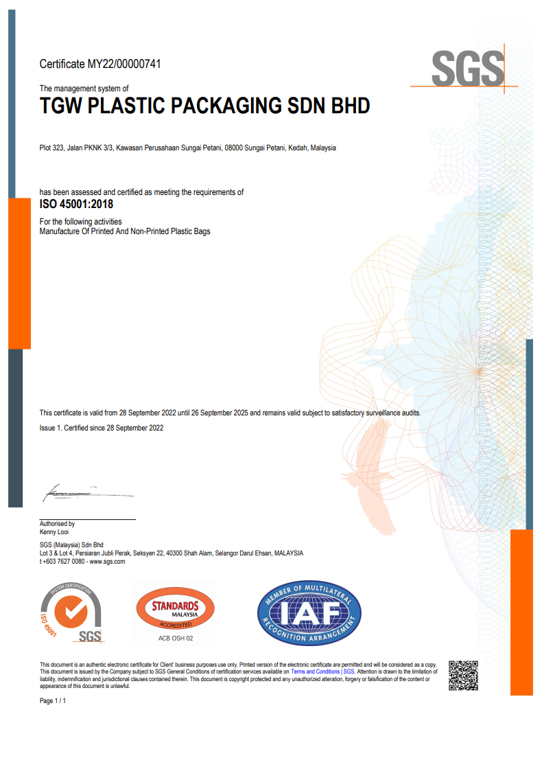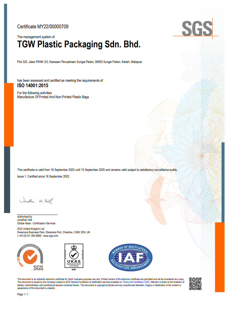 TGW Plastic Packaging Sdn Bhd is a joint venture setup with Hongkong, China company Landblue Company Limited founded in 2018. TGW Plastic Packaging is also one of the subsidiaries of Thong Guan Industries Berhad of plastic packaging company. The company is producer of courier bag and handle bag with upmost China technologies which is operating from Northern Malaysia, Kedah.